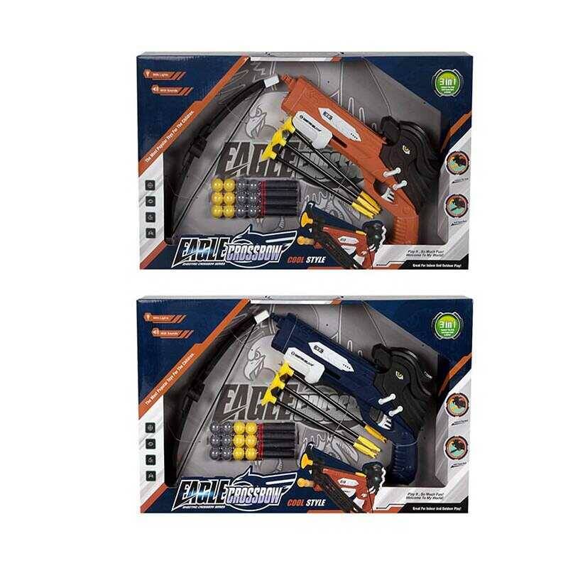Арбалет 949-14 (36/2) 2 кольори, 3 режими, світло, механічний принцип, звук орла, 3 стріли з присосками, 4 м’які патрони, 12 кульок, в коробці