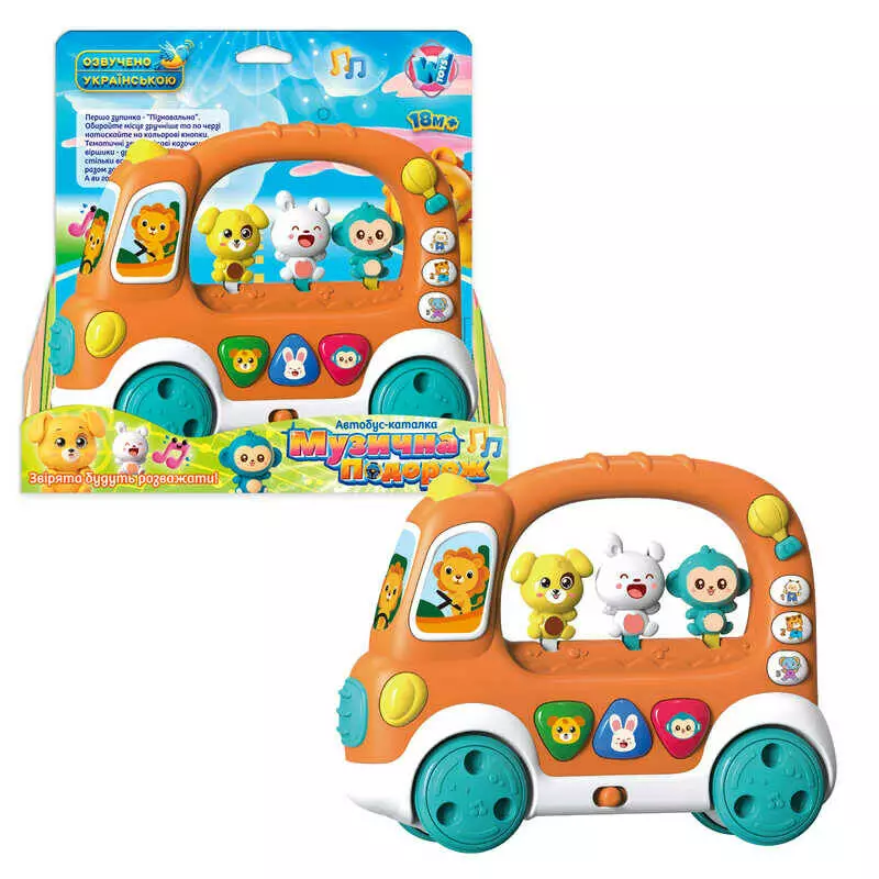 Автобус-каталка 19479 (48/2) "WToys", ОЗВУЧУВАННЯ УКРАЇНСЬКОЮ МОВОЮ, регулювання гучності, віршики, 6 казок, звуки, підсвічування, мелодії, рухомі еле