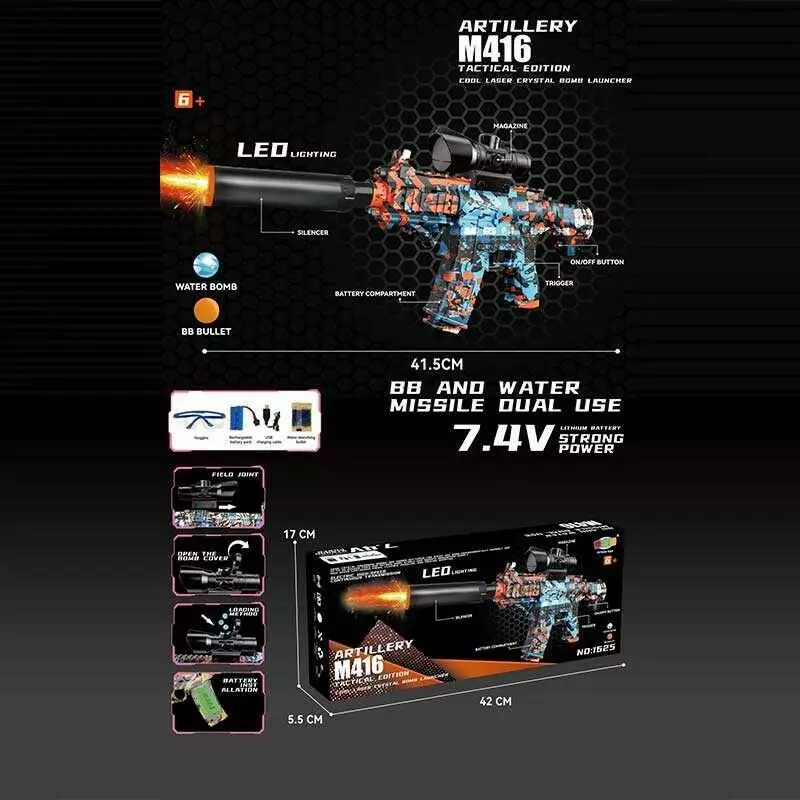 Автомат 1625-3 (36) автоматичний принцип роботи, акумулятор 7.4 V, стріляє орбізами, глушник з підсвічуванням, захисні окуляри, в коробці
