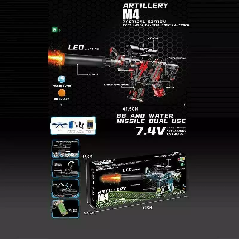 Автомат 1626-1 (36) автоматичний принцип роботи, акумулятор 7.4 V, стріляє орбізами, глушник з підсвічуванням, захисні окуляри, в коробці