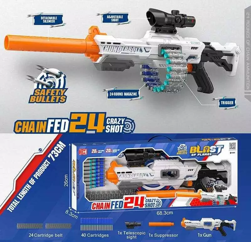 Автомат XH 920 (18) стріляє м’якими патронами, механічний принцип роботи, 40 патронів, приціл, магазин, глушник, в коробці