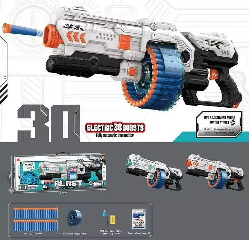 Автомат XH 9963 (12) 2 кольори, акумулятор: 4.8 V, довж.: 60 см, автомат. принцип, 40 м’яких патронів, барабан, 2 режими стрільби, USB, в коробці