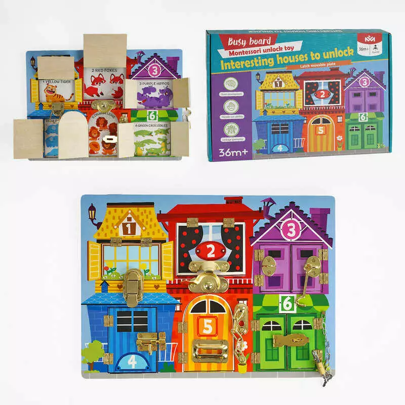 Бізіборд дерев`яний C 64848 (20) “Квартирки з тваринами”, 6 видів замочків, що відкривають віконця, в коробці