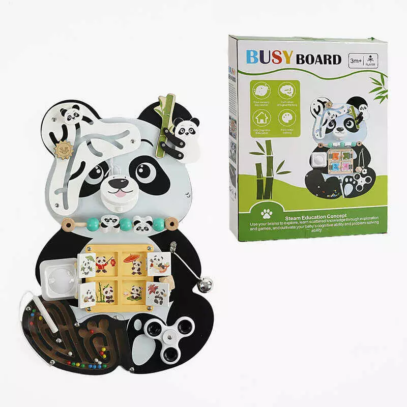Бізіборд дерев`яний C 68272 (9) “Панда”, 9 ігор, пальчиковий лабіринт, магнітна гра, спінер, дверцята, рахівниця, лампа, в коробці