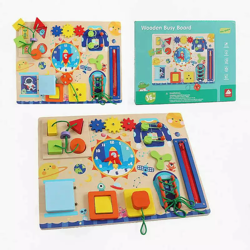 Бізіборд дерев`яний C 71020 (15) шестерні, геометричний сортер, спіннер, застібки, годинник, в коробці