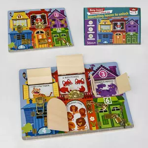Бізіборд дерев`яний С 49417 (20) “Квартирки з тваринами”, 6 видів замочків, що відкриваються віконця, в коробці