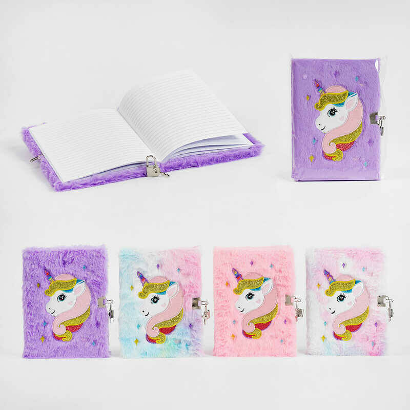 Блокнот М 15019 (120) 4 кольори, хутряна обкладинка, вишивка, єдиноріг, замочок, у лінійку, у пакеті, ВИДАЄТЬСЯ ТІЛЬКИ МІКС ВИДІВ