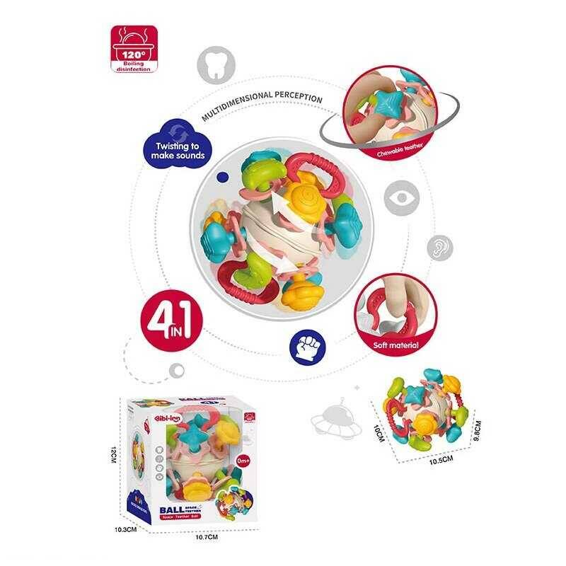 Брязкальце 6045 (60) 4 в 1: тріскачка, пальчикові ігри, прорізувачі, брязкання, обертання частин кулі, в коробці