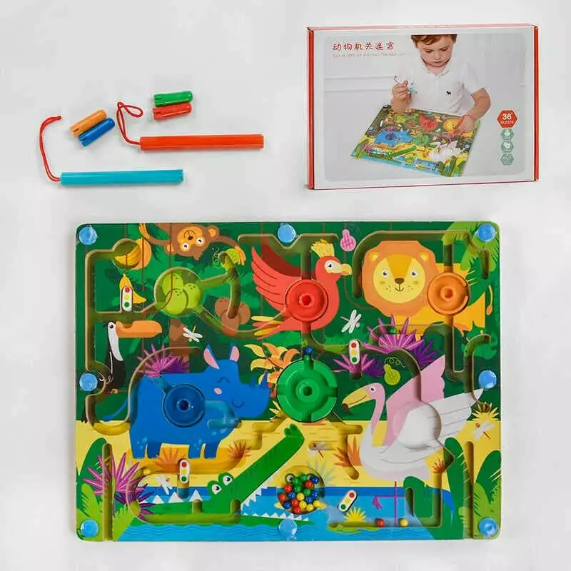 Дерев`яна гра С 47975 (26) лабіринт "Джунглі", палички з магнітним наконечником, важелі для перешкод, в коробці