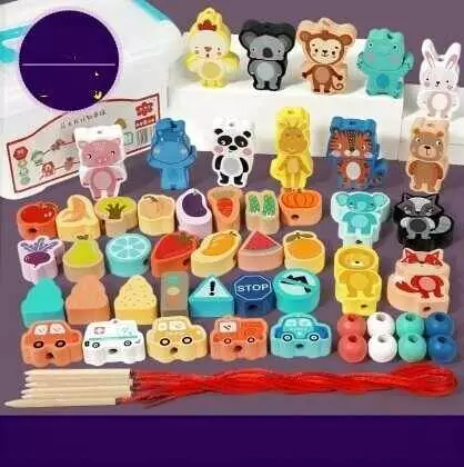 Шнурівка дерев`яна С 74433 (24) фігурки з транспортом, дорожніми знаками, тваринами, фруктами й овочами, намистини, шнурки з дерев’ян. краєм, в боксі