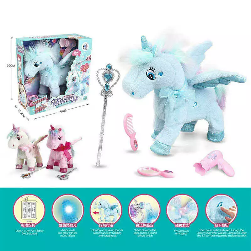Інтерактивна іграшка 55 J-8 (24/2) "Єдиноріг", музика, звук, підсвіч., сенсорний датчик, повторює звуки, ходить, гребінець, дзеркало, фен, в коробці