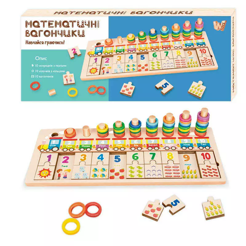Логічна дерев’яна дошка 36923 / 36926 (24) "WToys", пазли, кілочки та кільця, 10 вагончиків, в коробці