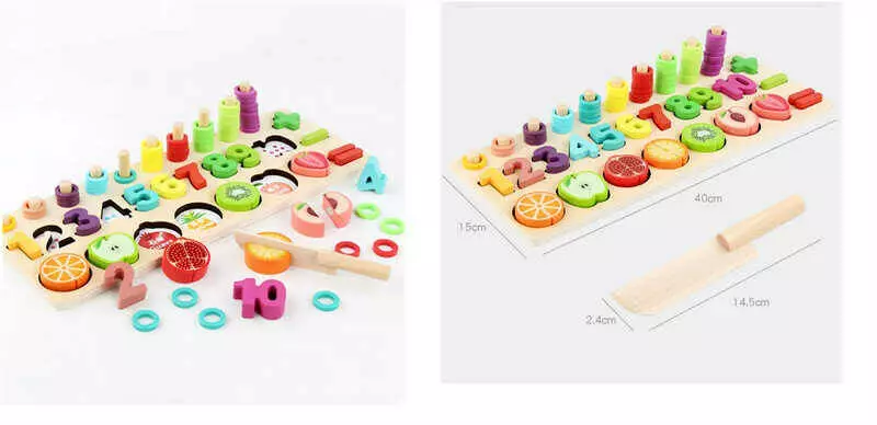 Логічна дерев’яна дошка C 65785 (40) половинчаті фрукти, кілочки з кільцями, сортер, цифри, знаки додавання-віднімання, дорівнює, в коробці
