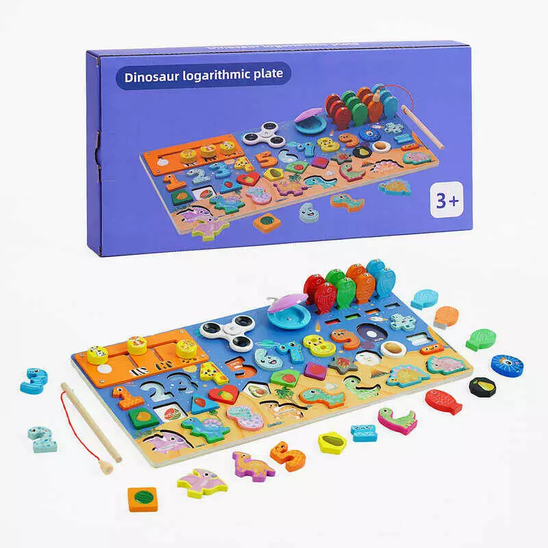 Логічна дерев’яна дошка 63983 / MBS 2304 / 6610-А1 (20) цифри, фігури, написи рос. мовою, пальчикові ігри, риболовля, динозаври, в коробці