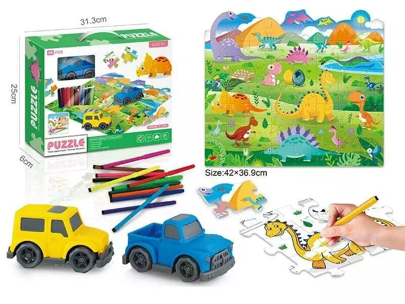 Двосторонній пазл 7077-103 (48/2) “Динозаври”, 56 елементів, фломастери 12 кольорів, розфарбовка, машинка, пазл 42х37 см, в коробці