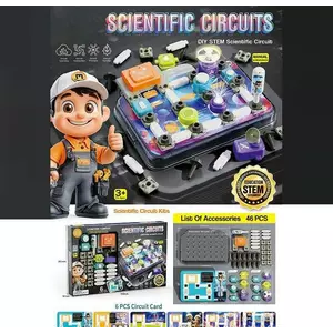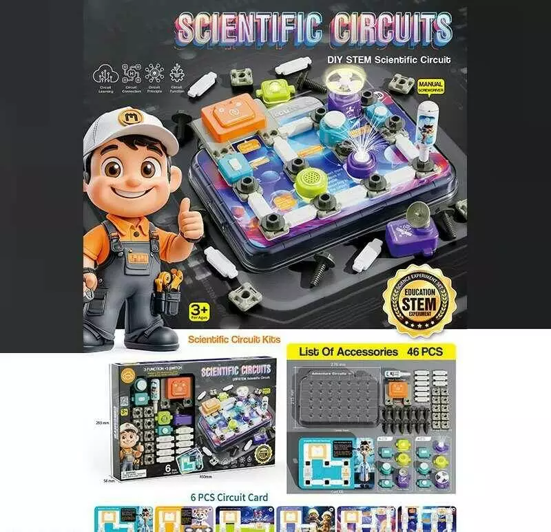 Електронний конструктор 77-55 K (24) 46 елементів, підсвічування, вентилятор, мелодія, 3 види перемикачів, 6 карток із прикладами, в коробці