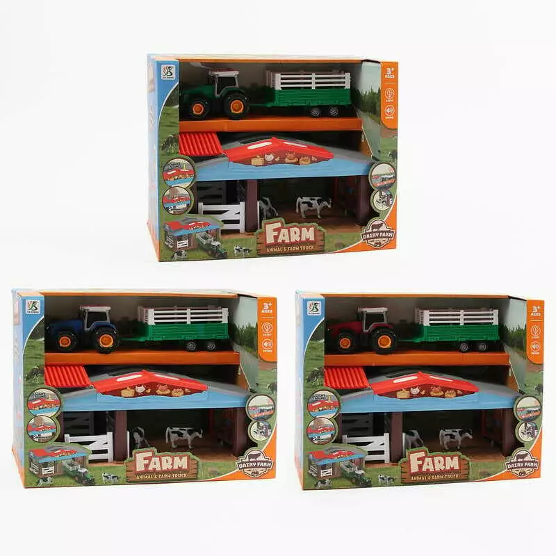 Ферма 0488-1301 (18/2) 3 види, трактор 13х9х8 см, хлів 32х16.5х14.5 см, причеп, тварини, підсвічування, звуки, в коробці, ВИДАЄТЬСЯ ТІЛЬКИ МІКС ВИДІВ
