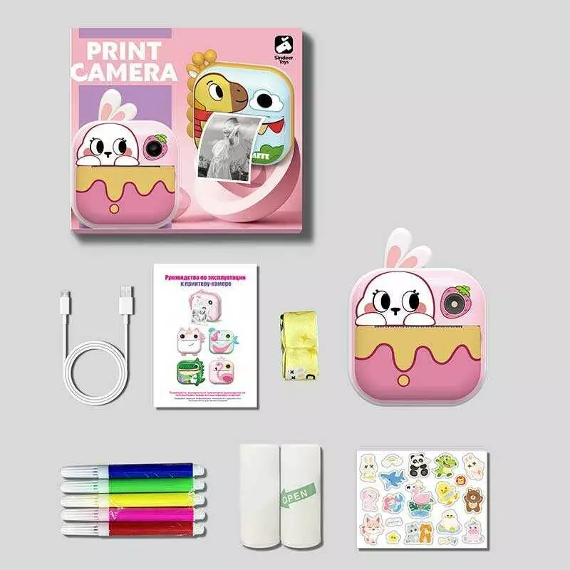 Фотоапарат-принтер M 5 R (50) фронтальна камера, дріт micro USB, роз’єм для SD карти, 2 рулони термопаперу, ремінець, наліпки, фломастери, в коробці