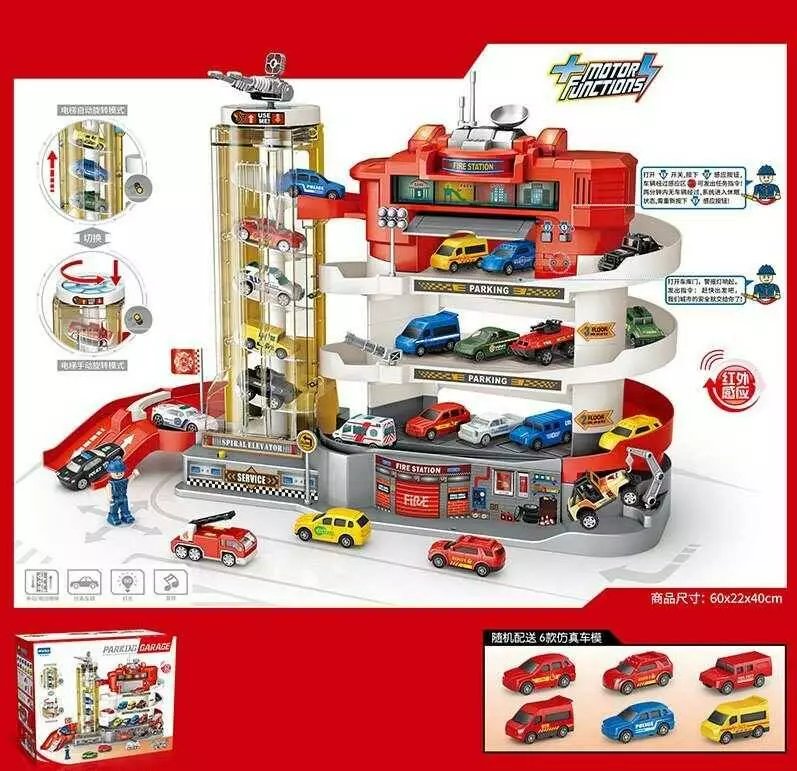 Трек Е 7004 / В 6003 (4) 4 поверхи, 6 машинок, автоматичний витяг, світло, звук, англійська озвучка, в коробці