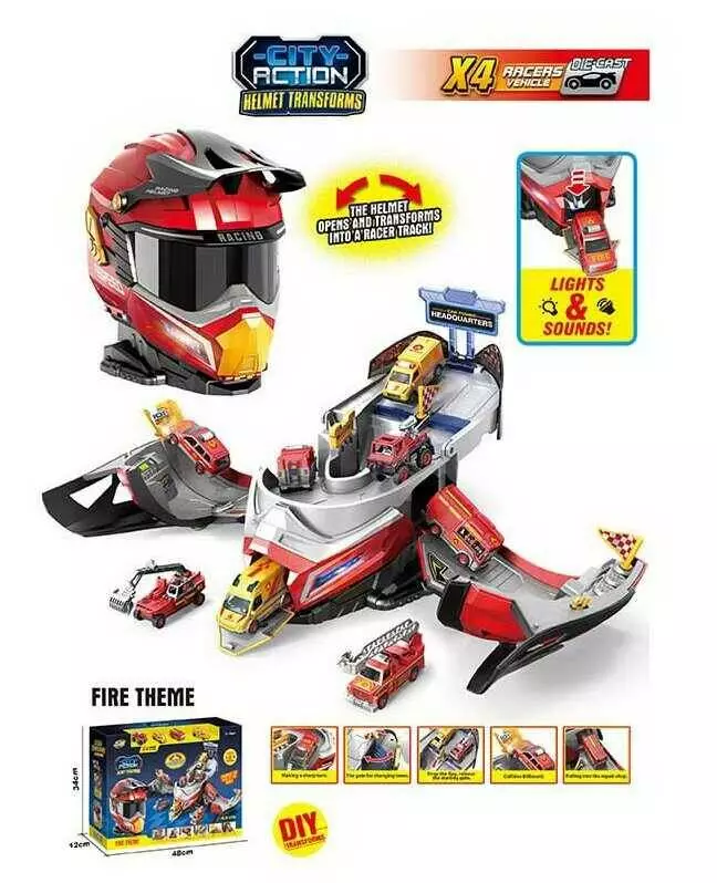 Трек SK 637 XA (12) звуки, підсвічування, рухливі елементи, складається у шолом, 4 металопластикові машинки, в коробці