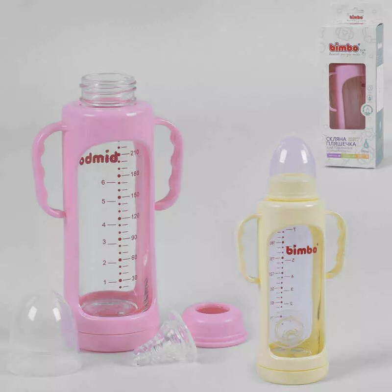 гр Бутылочка стеклянная 15374 (48) с силиконовой соской, "BIMBO", 240 мл, 2 цвета, 1шт в коробке