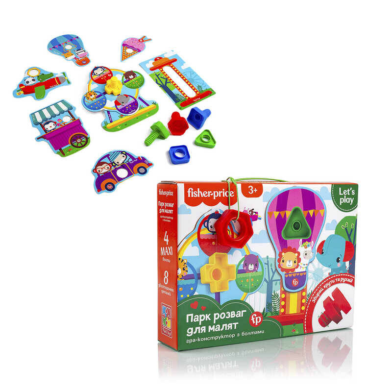 гр Гра настільна "Парк розваг. Гра-конструктор з болтами" Fisher-Price VT2905-21 (6) "Vladi Toys", 13 деталей, 4 болтика, 4 гайки