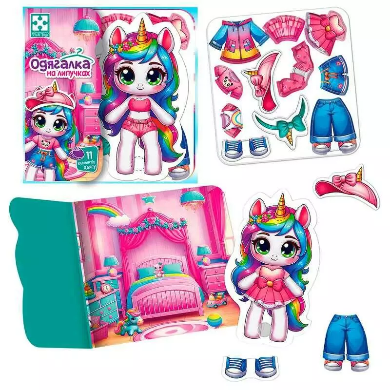 гр Гра з липучками "Єдиноріжка" VT1320-01 (90) "Vladi Toys", фігурка тваринки, 11 предметів одягу, ігровий фон