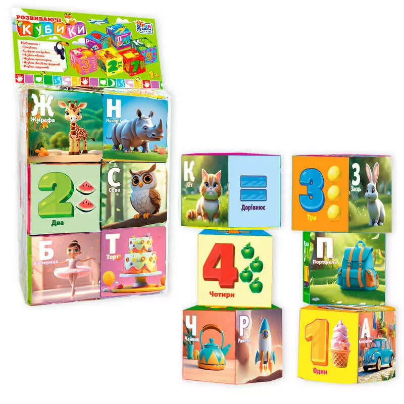 гр Кубики 53344 (36/2) "4FUN Game Club", 6 штук, м`які, водонепроникна тканина, літери, цифри, арифметичні знаки, в пакеті