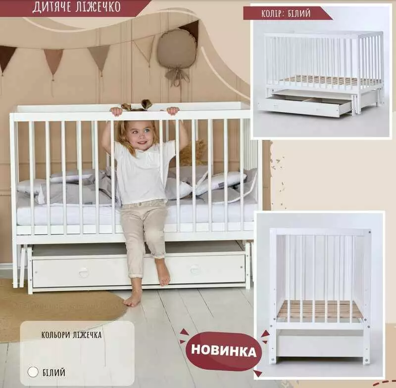 гр Ліжечко дитяче "КАЗКА" (1) шарнир-підшибник з висувною палочкою+шухляда (Білий+біла палочка)