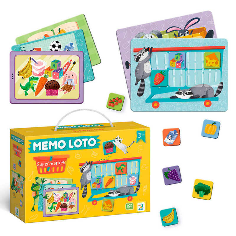 гр Мемо лото "Супермаркет" 301228 (36) "Dodo", 4 картки-валізи, 4 картки-списки, 32 фішки, в коробці