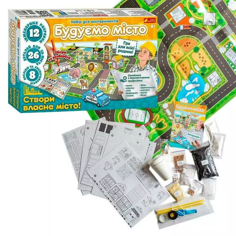 гр Набір для експериментів "Будуємо місто" 10100674У (6) "Ранок", 12 інженерних проєктів, 8 наукових експериментів, 26 деталей, в коробці