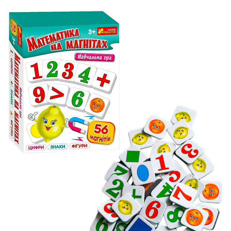 гр Математика на магнітах 10109173У (10) "Ранок", 56 елементів, цифри, арифметичні знаки, геометричні фігурки, фрукти, в коробці