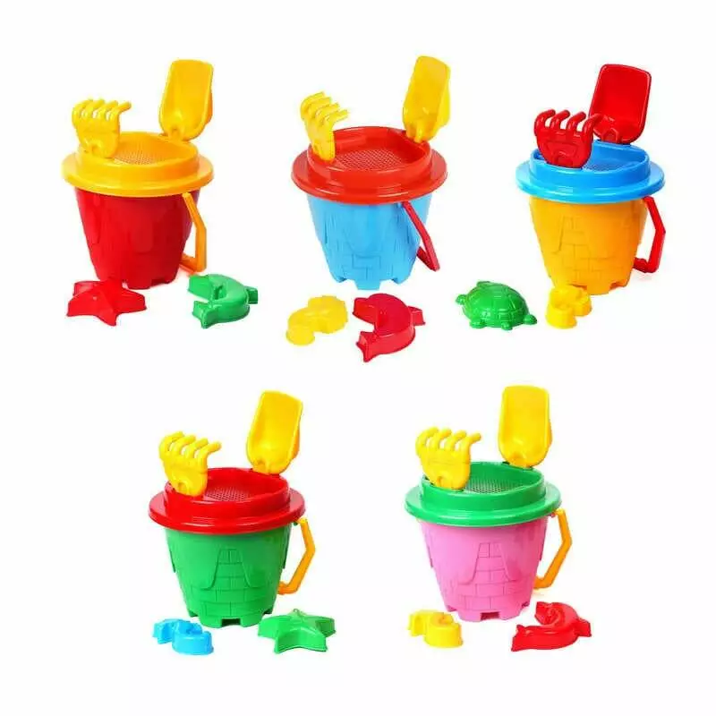 гр Песочный набор "Замок" 2278 (6) ЦЕНА ЗА 10 ШТУК В УПАКОВКЕ "Technok Toys", 5 цветов, ведерко, сито, лопатка, грабельки, 2 формочки, в сетке