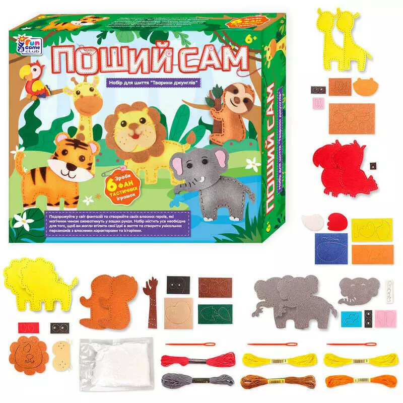 гр Поший сам 89447 (18/2) "4FUN Game Club", “Тварини джунглів”, 6 фігурок, шаблони з фетру, нитки, пластикові голки, наповнювач, в коробці