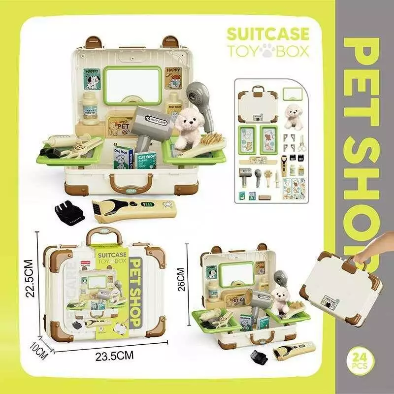 Набір для грумінгу 8 HT 02 (60/2) м’яка іграшка - тваринка, імітація роботи машинки для стрижки, фен, гребінець, ножиці, шприць, пляшечки, у валізі
