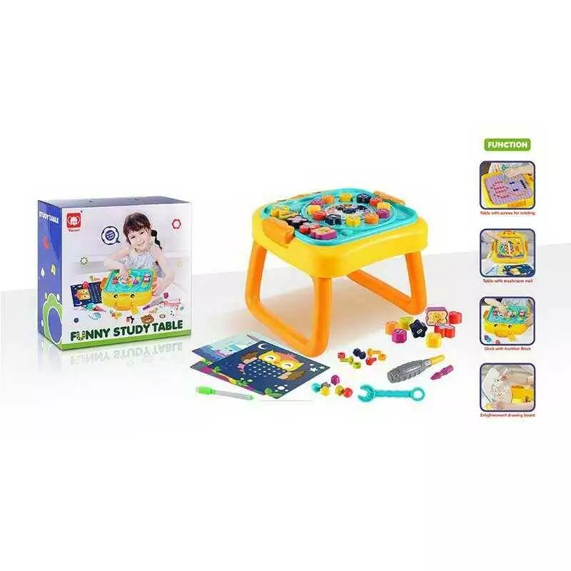 Ігровий столик 835 (18) мозаїка, дошка пиши-витирай, болтики, викрутка, геометричний сортер, пазл, годинник, цифри й математичні знаки, в коробці