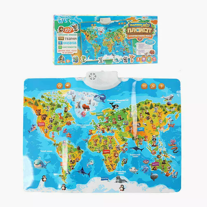 Інтерактивний плакат «Мапа світу» 97899 (45) "WToys", ОЗВУЧ. УКР. МОВОЮ, назви тварин, океанів, континентів, “екзамен”, регулюв. гучн., в коробці