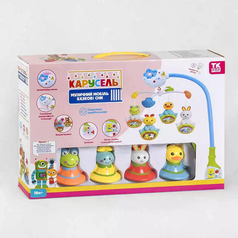 Карусель 29238 (18) "TK Group", ОЗВУЧУВАННЯ УКРАЇНСЬКОЮ МОВОЮ, 4 підвіски брязкальця, на ліжечко, обертання, підсвічування, 6 мелодій, в коробці