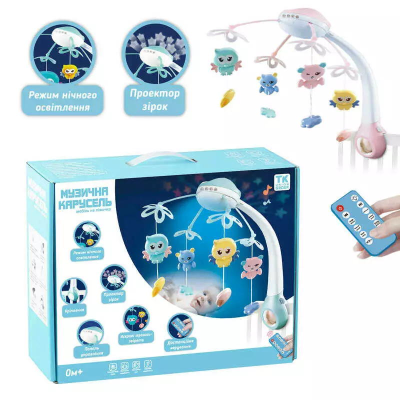 Карусель 56810 (12) "TK Group" РОЖЕВА!!! 4 підвіски, пульт р / к, на ліжечко, проєктор, обертання, мелодії, звуки, колискові, в коробці