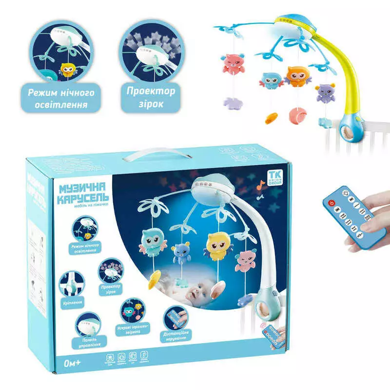 Карусель музична 73814 (12/2) "TK Group" салатовий з БЛАКИТНИМ, 4 підвіски, пульт р/к, проєктор, обертання, мелодії, звуки, колискові, в коробці