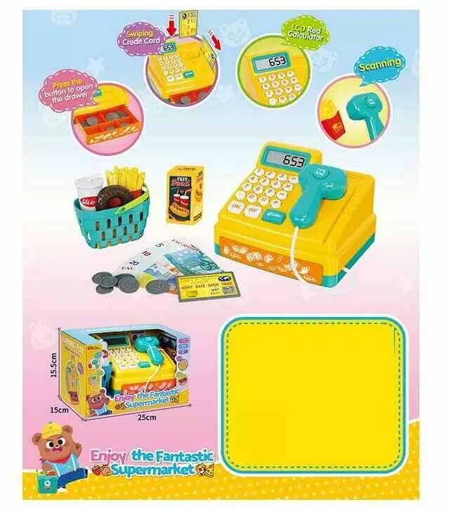 Касовий апарат 35653 (12/2) світло, звук, калькулятор, сканер, автомат. висування шухляди, кошик, муляжі продуктів, грошей, кредитн. картки, в коробці