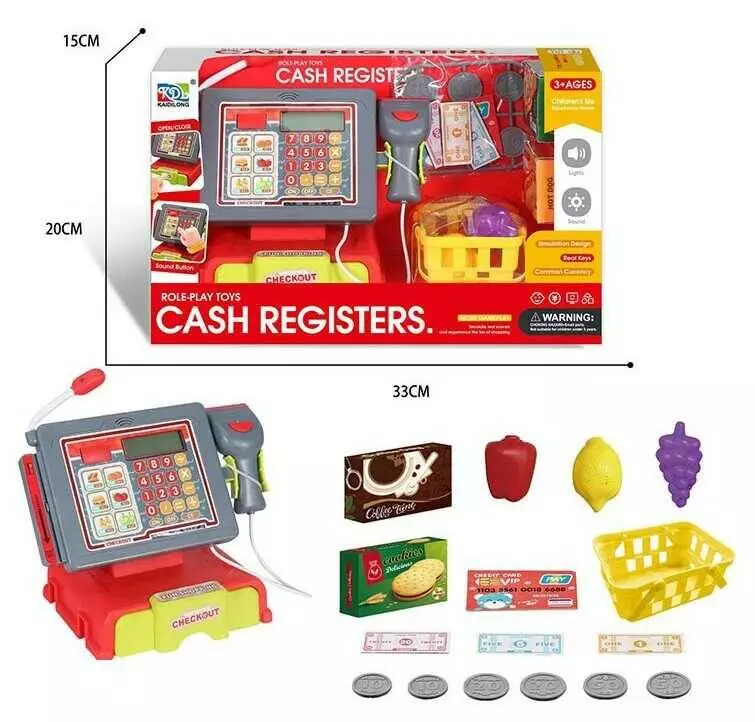 Касовий апарат KDL 888-58 (36/2) розмір: 21х14х17 см, сканер, калькулятор, мікрофон, звук, підсвічування, висувн. ящ., кошик, овочі, гроші, в коробці