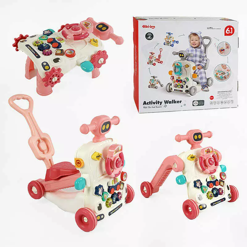Каталка 6038 (5) рожева, 6 в 1, трансформується у толокар, батьківська ручка, звуки, мелодії, підсвічування, пискавка, сортер, шестерні, в коробці