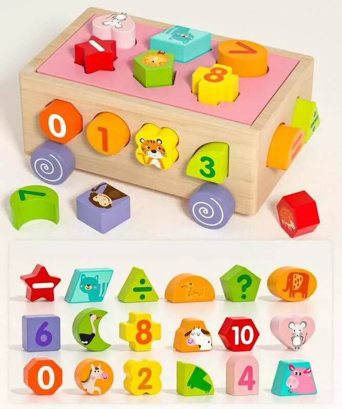 Каталка C 75515 (24) дерев’яна, сортер із фігурками, математичні знаки, в коробці