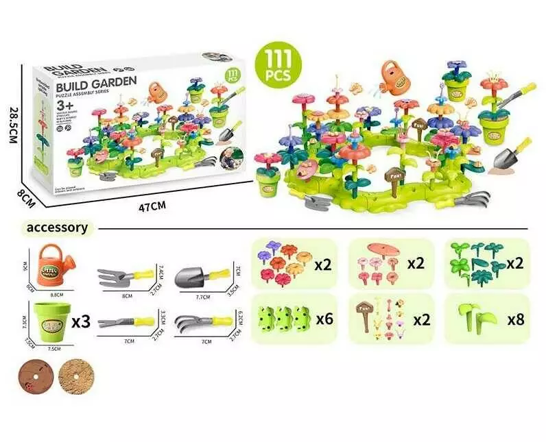 Конструктор A 42-3 (36/2) “Квітковий сад”, набір садівника,111 елементів, граблі, лопата, вила, лійка, вазон, квіти, в коробці