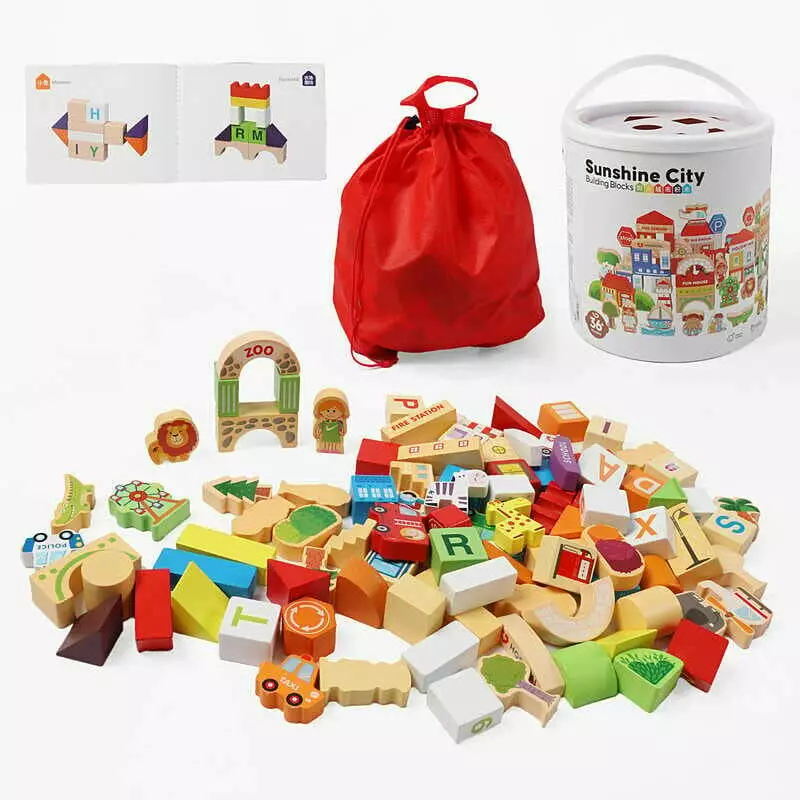 Конструктор дерев’яний C 74149 (12) фігурки людей, тваринок, транспорту, літери англійського алфавіту, назви установ англійською, мішечок, у відрі