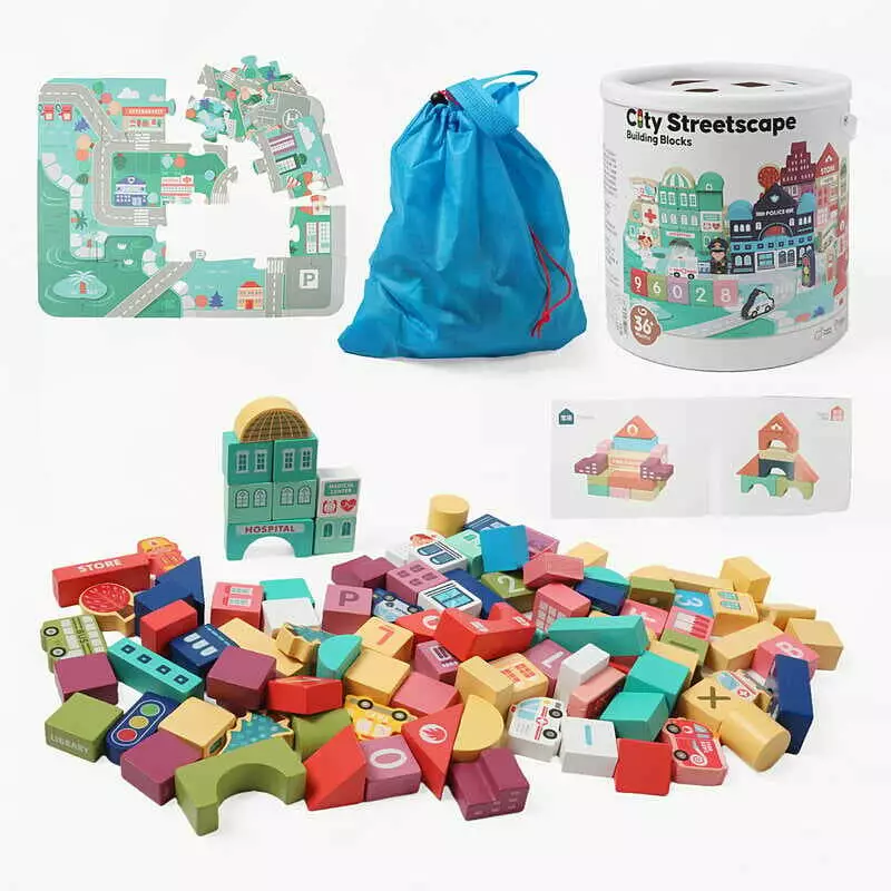 Конструктор дерев’яний C 74158 (12) пазли, фігурки людей, транспорту, літери англійського алфавіту, цифри, назви установ англійською, мішечок, у відрі