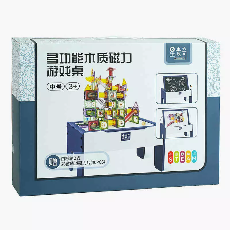 Магнітний конструктор XC-B 13 (4) 30 деталей, тунелі, кулька, дерев’яний стіл 55х37х23 см, двостороння дошка для малювання, маркери, в коробці