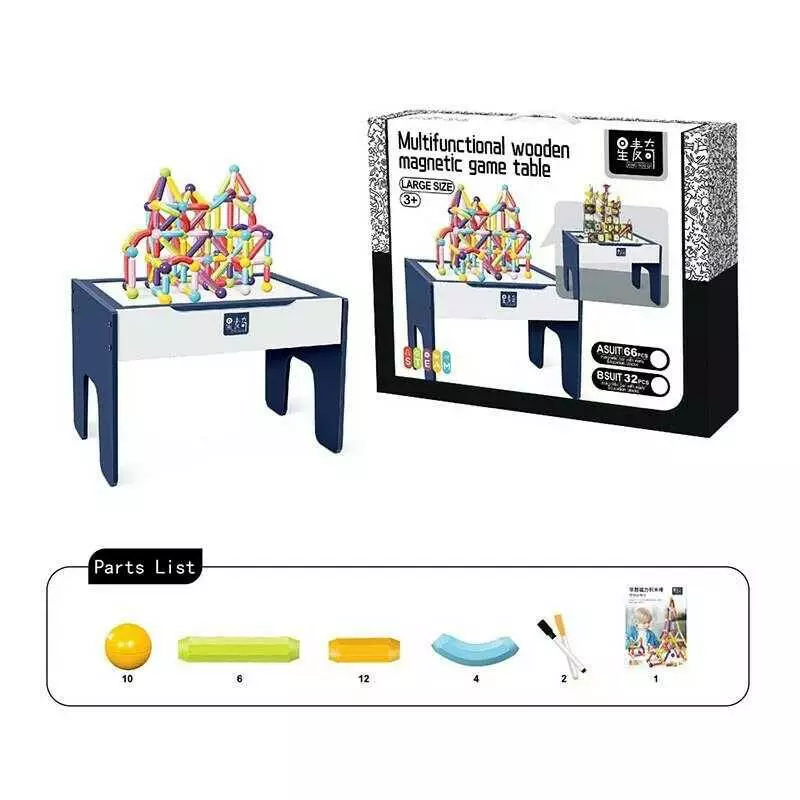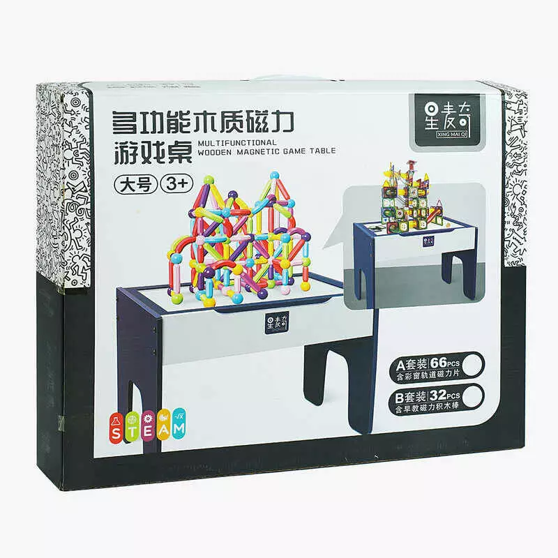 Магнітний конструктор XC-B 28 (4) 32 деталі, дерев’яний стіл 55х38х39 см, двостороння дошка для малювання, маркери, в коробці