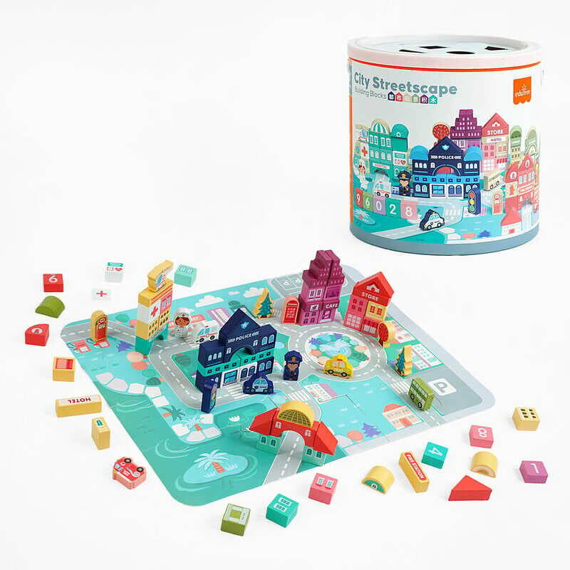 Конструктор С 65444 (12) дерев’яний, 100 деталей, фігурки, пазли, ігрове поле, чохол, сортер, у відрі